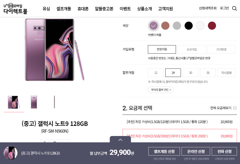 요금제를 조금 낮추면 월 20,900원에도 갤럭시노트9를 이용할 수 있습니다.