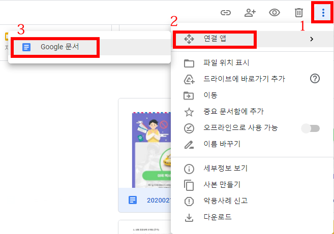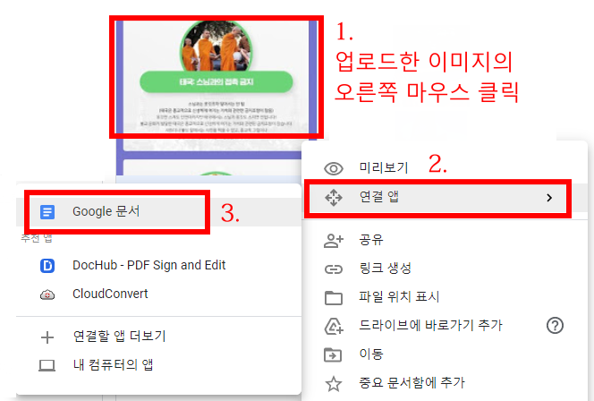 이미지를 업로드하고 문서 변환 후, 둘 중의 한 가지 방법으로 업로드한 이미지를 구글 문서로 변환합니다.